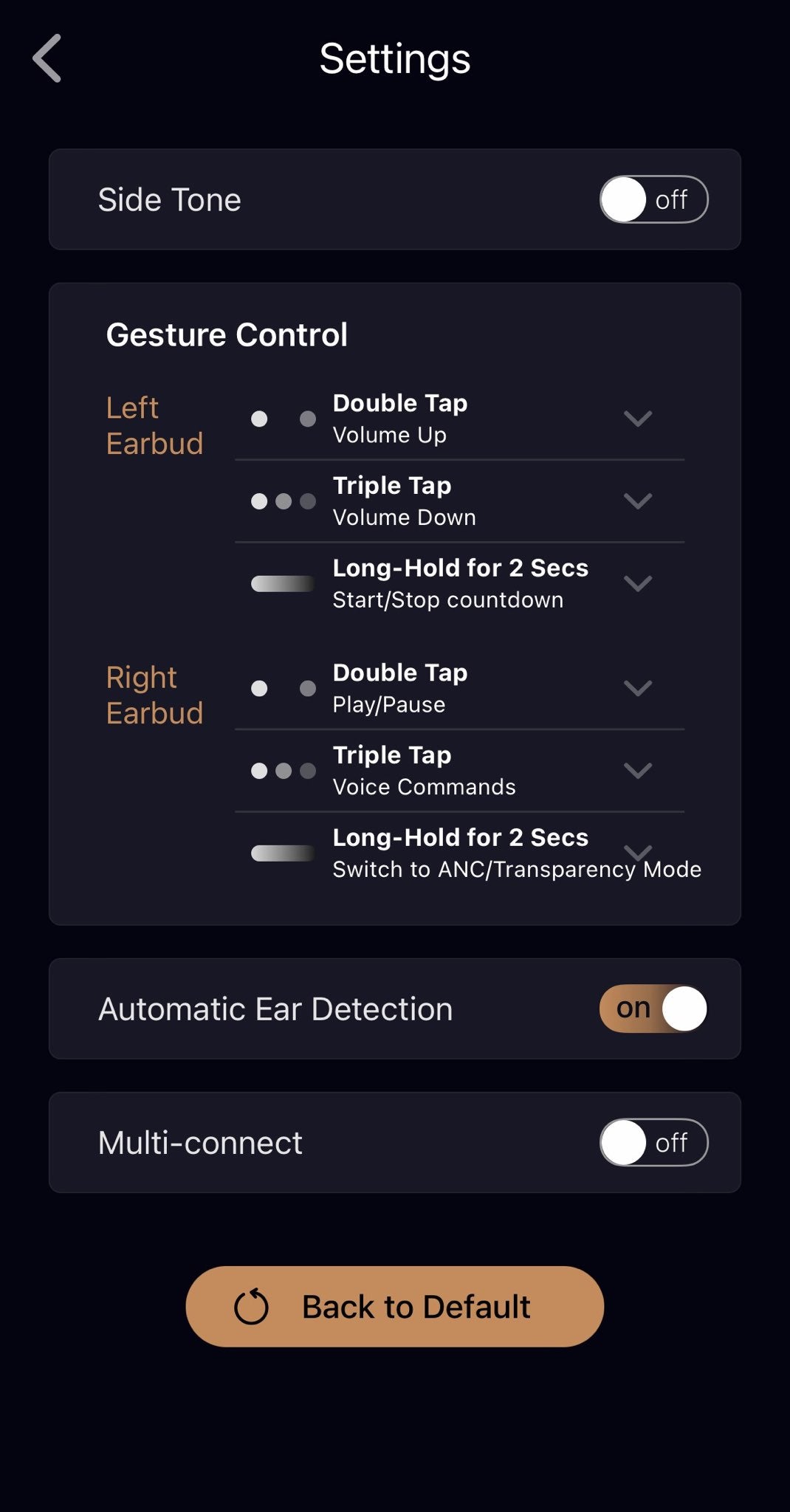 In the settings screen, you'll see the right and left earbuds, and each should correspond with 1 tap, 2 taps, and a 2-second hold command. To the right of it, there's a drop-down menu you can open and select from the list of functions you'd like to have for each command.